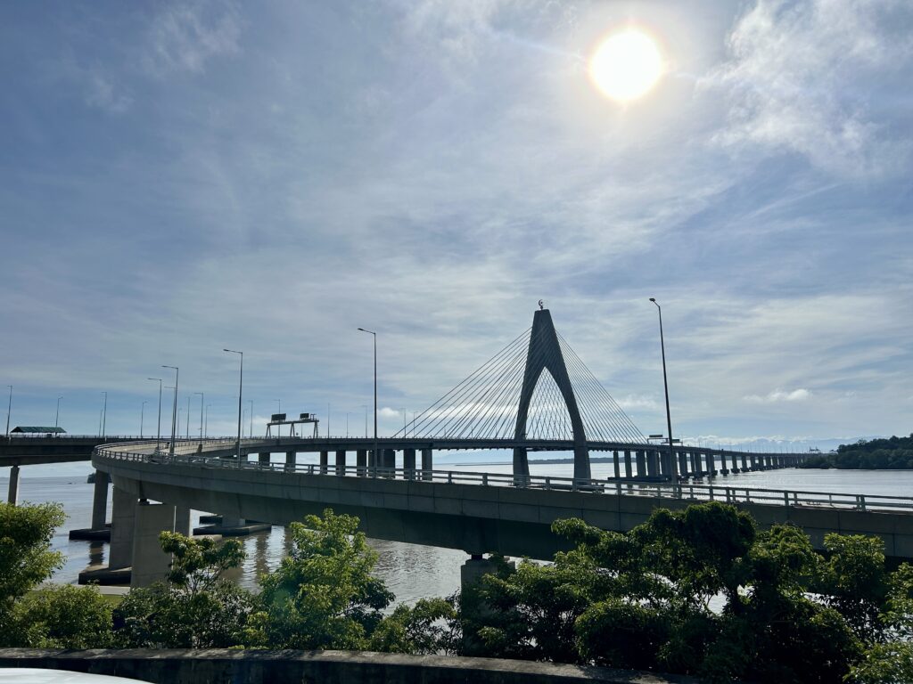 ホテルを出発して、まず立ち寄った場所が、「Jambatan Sultan Haji Omar ‘Ali Saifuddien Bridge」ムアラ地区と、ウル・テンブロン国立公園を擁するテンブロン地区を直接結ぶ橋です。かつてテンブロン地区は、ボートかマレーシア経由の陸路でしか行けない「飛び地」でした。しかし、2020年に橋が開通し状況は一変しました。以前は、車でマレーシアを経由もしくはスピードボードでの移動しかありませんでしたが、今では入国審査の必要もなく車で30分程での移動が可能になりました。東南アジアで最も長い橋として知られています。現在はテンブロン地区とは反対方面に工事中で、最終的にはエンパイアホテル付近まで繋がる予定のようです。