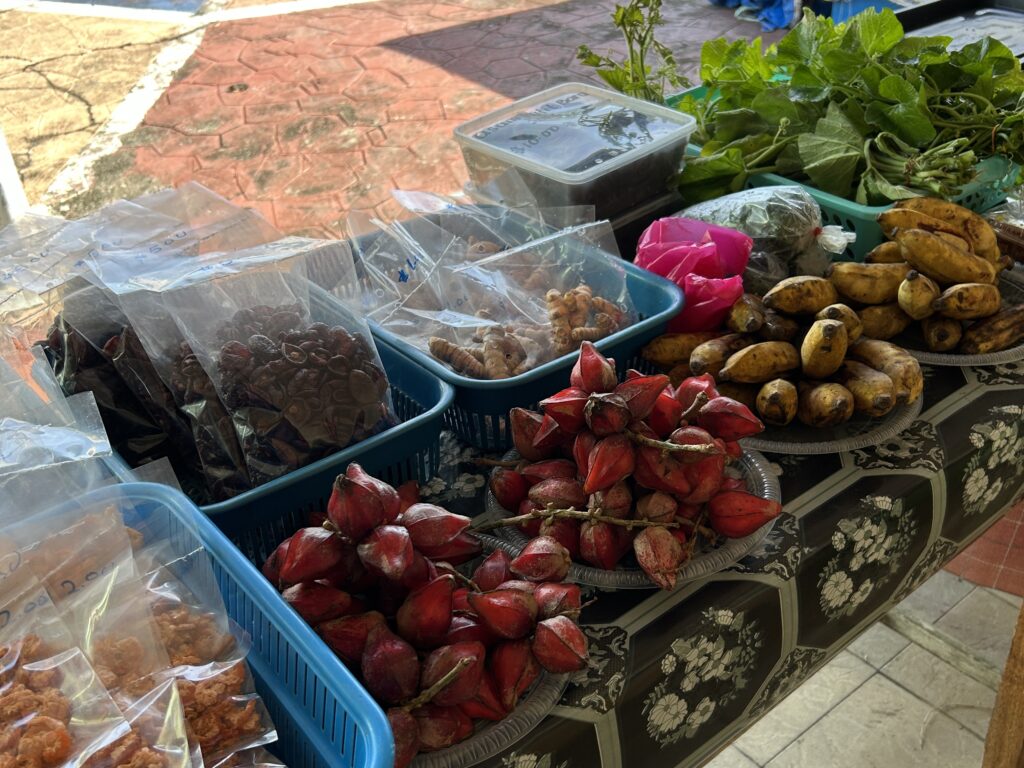 途中休憩。ガイドさんによると、もともとはナイトマーケットとして作られたのですが、夜は周辺が暗くあまり活気がなかったので、今は朝市として栄えています。見たこともない野菜や香辛料が販売されていました。