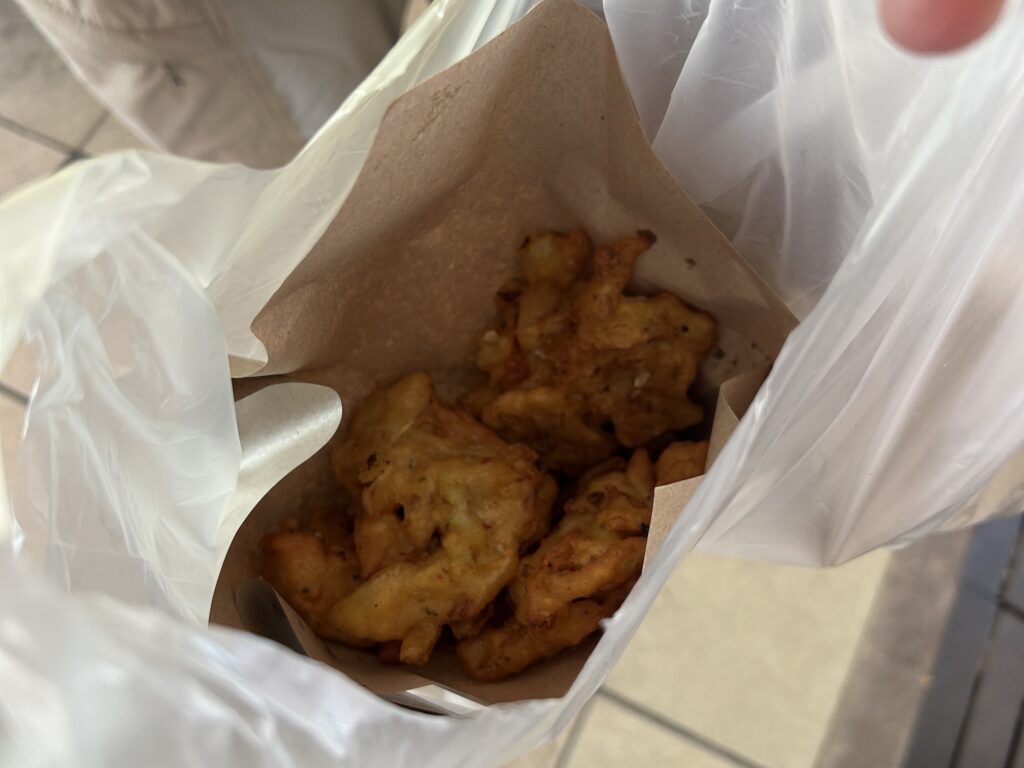 ガイドさんが自分の朝ごはんで買った「えびのかき揚げ」をおすそ分けをいただきました。