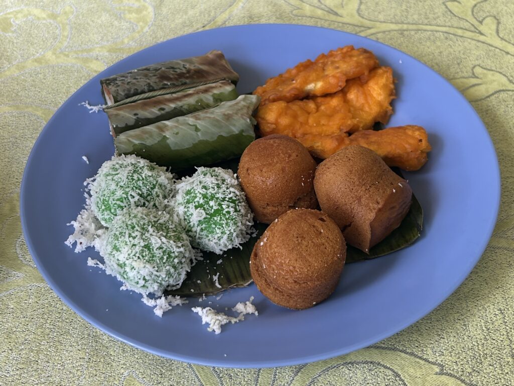左上から時計回りでチマキ(中はもち米)・揚げバナナ・黒糖パン・ココナッツのお菓子