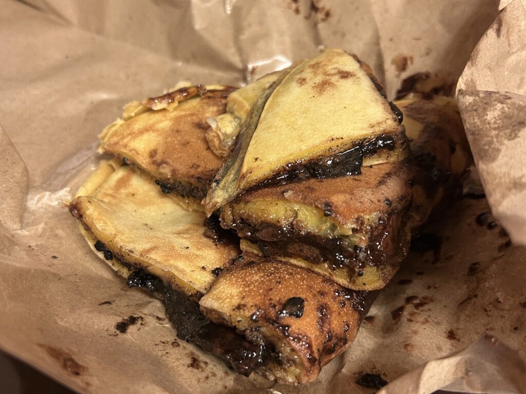 デザートに買ったのは、「クエンマライヤ」。厚めのクレープ生地にナッツペーストやチョコレート等を挟んだ物。お値段は$5で、量が多かったので持ち帰りにしてホテルの部屋で紅茶と一緒にいただきました。