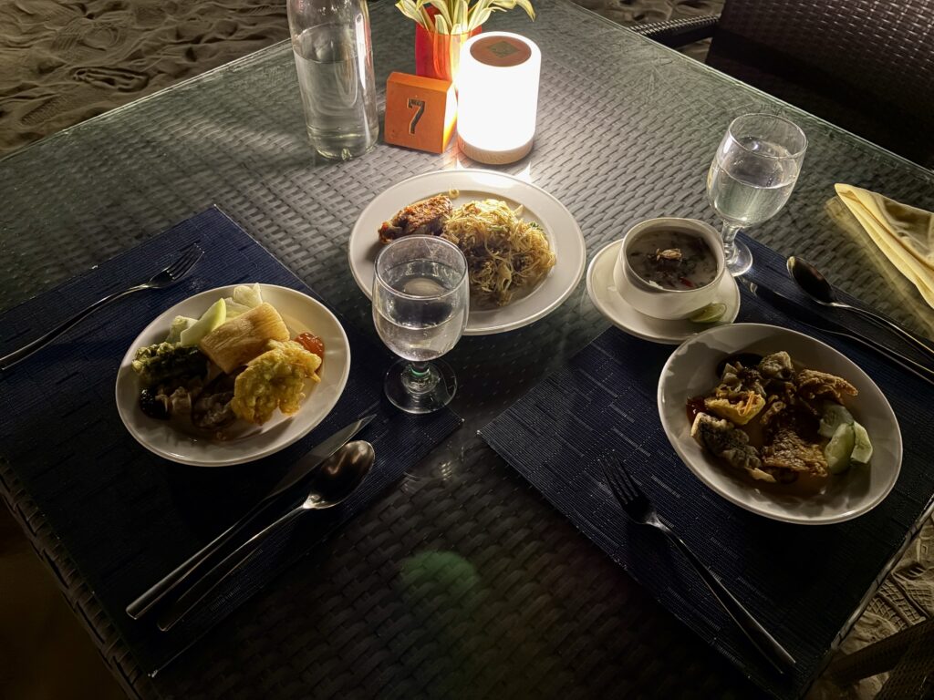 前菜、揚げ物、メイン、デザートなど各料理の場所にスタッフさんいて、どんな料理かひとつずつ丁寧に教えてくれました。さりげなくも温かいサービスも相まって、とても満たされる夜となりました。